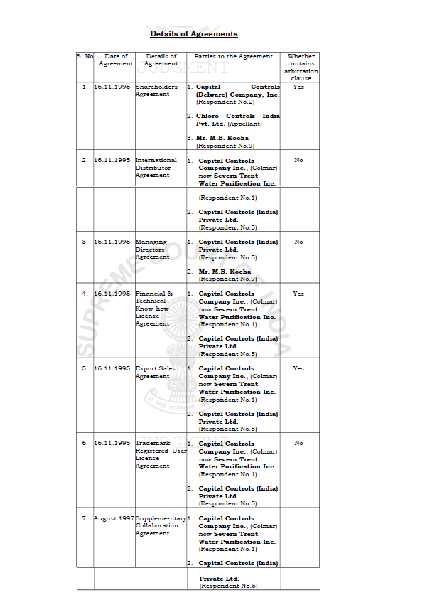 135. The Corporate structure of the companies in the present case has already been stated by us in paragraph 7 which we need not refer here again in detail. Suffice it to note that Kocha group had floated a company and incorporated the same under the Indian laws, which was carrying on the business of manufacture of chlorination equipment under the name and style ‘Chloro Control India Private Limited’. They were negotiating with Severn Trent Water Purification Inc. for an international joint venture agreement to deal with the manufacture, distribution and sale of gas chlorination equipment and electro-chlorination equipment, “Hypogen Series 3300” etc. On this basis, they had entered into a joint venture agreement which was signed between them. The joint venture agreement contemplated that the business shall be carried on under the name and style of Capital Controls India Ltd. Private Limited. The agreements gave 50 per cent shareholding to the foreign collaborators which were to be equally divided between Capital Control (Del) Company Inc. and Capital Control Company Inc. These joint venture agreements were executed between the parties on 16th November, 1995 but the joint venture company had been incorporated on 14th November, 1995 itself. Severn Trent Services (Del) Inc. is the holding company of the companies which have entered into the joint venture agreement for floating both, the Capital Control India Ltd. as well as Severn Trent De Nora LLC. The disputes had arisen actually between the Kocha Group on the one hand and Severn Trent Water Purification Inc. on the other, and the disputes were mainly with regard to Capital Control (India) Pvt. Ltd. Inc. Now, we must note, even at the cost of repetition, the parties signatory to each of these agreements and we must also note which of these agreements did not contain arbitration clause. Shareholders Agreement dated 16th November, 1995 was executed between the Capital Control (Delaware) Company Inc. and Chloro Control India Private Ltd. Capital Control Delaware Company Inc. was a subsidiary of Severn Trent Services (Delaware) Inc. and was formed on 21st September, 1994. Capital Control Company Inc. came to be merged with Capital Control (Delaware) Company Inc. in March 1994. As a result the Capital Control Delaware Company was no more in existence. Thus, the reference to Capital Control Company Inc. includes reference to Capital Control Company Inc. as well as Capital Control (Delaware) Company Inc.