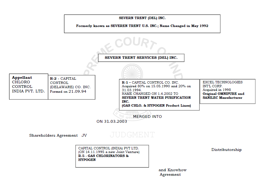 11. This corporate structure clearly indicates that Severn Trent Services (Del.) Inc. is the holding company of the companies which have entered into the joint venture agreements, for floating both the companies Capital Controls (India) Pvt. Ltd., as well as “Severn Trent De Nora LLC”. The disputes have actually arisen between Chloro Controls (India) Pvt. Ltd. and the Kocha Group on the one hand, and Severn Trent Water Purification Inc., the erstwhile Capital Control (Delaware) Co. Inc. and Capital Control Co. Inc. on the other.